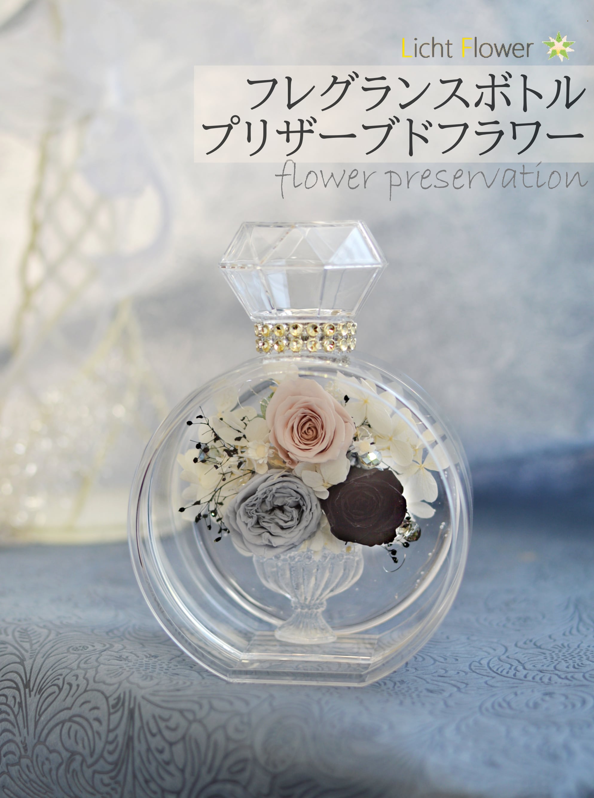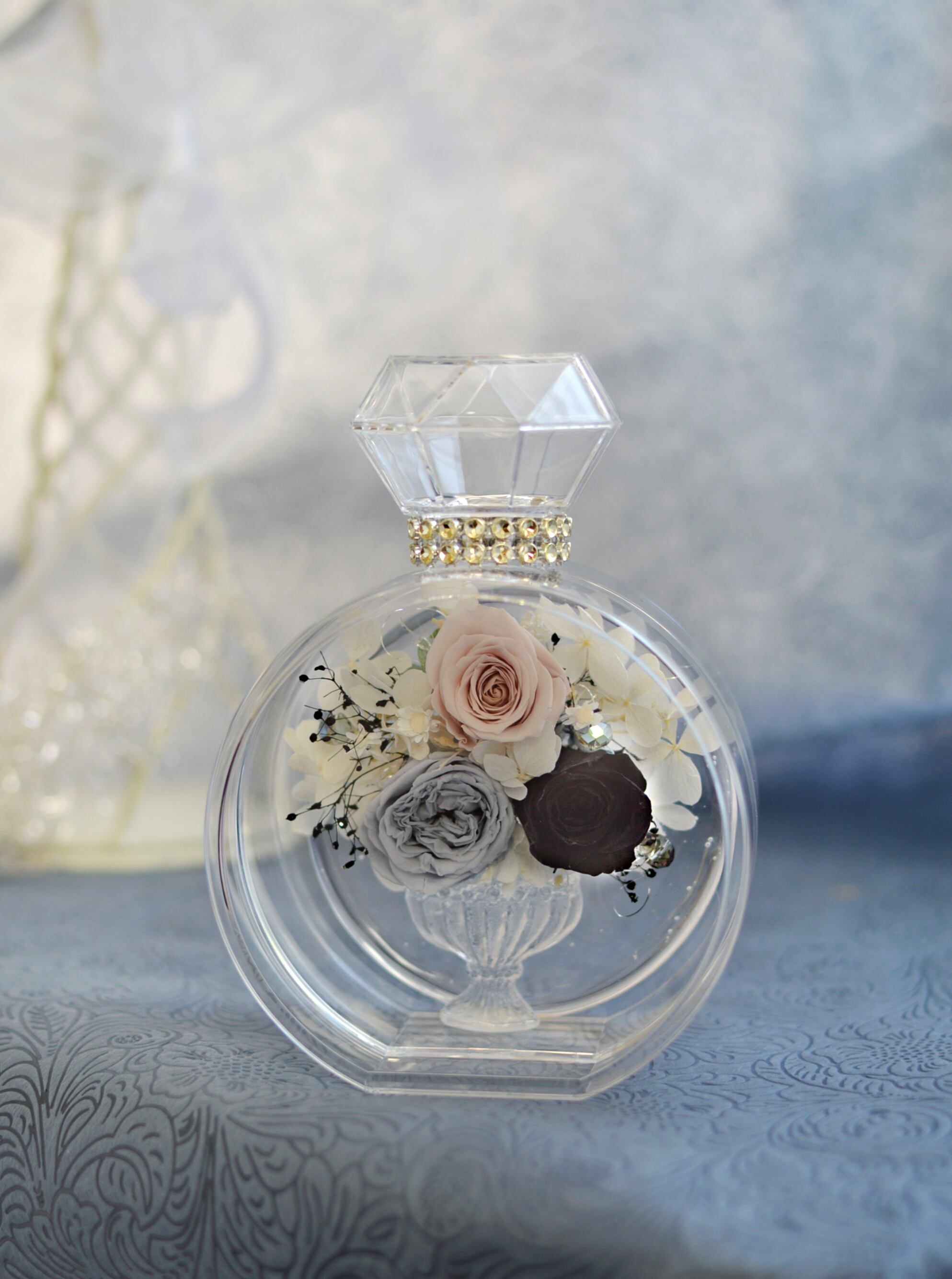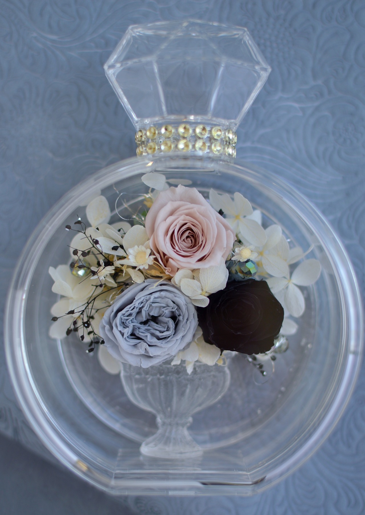 黒バラとヌーディーなベージュを融合させたフレグランスボトルのアレンジ
