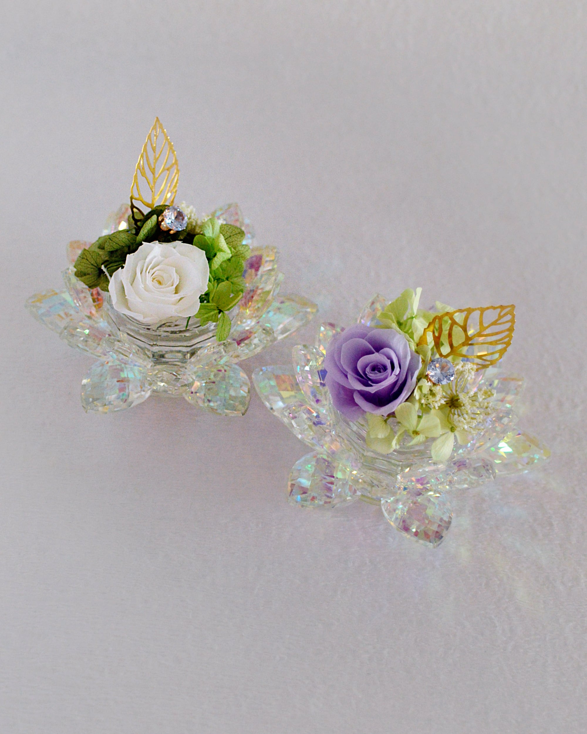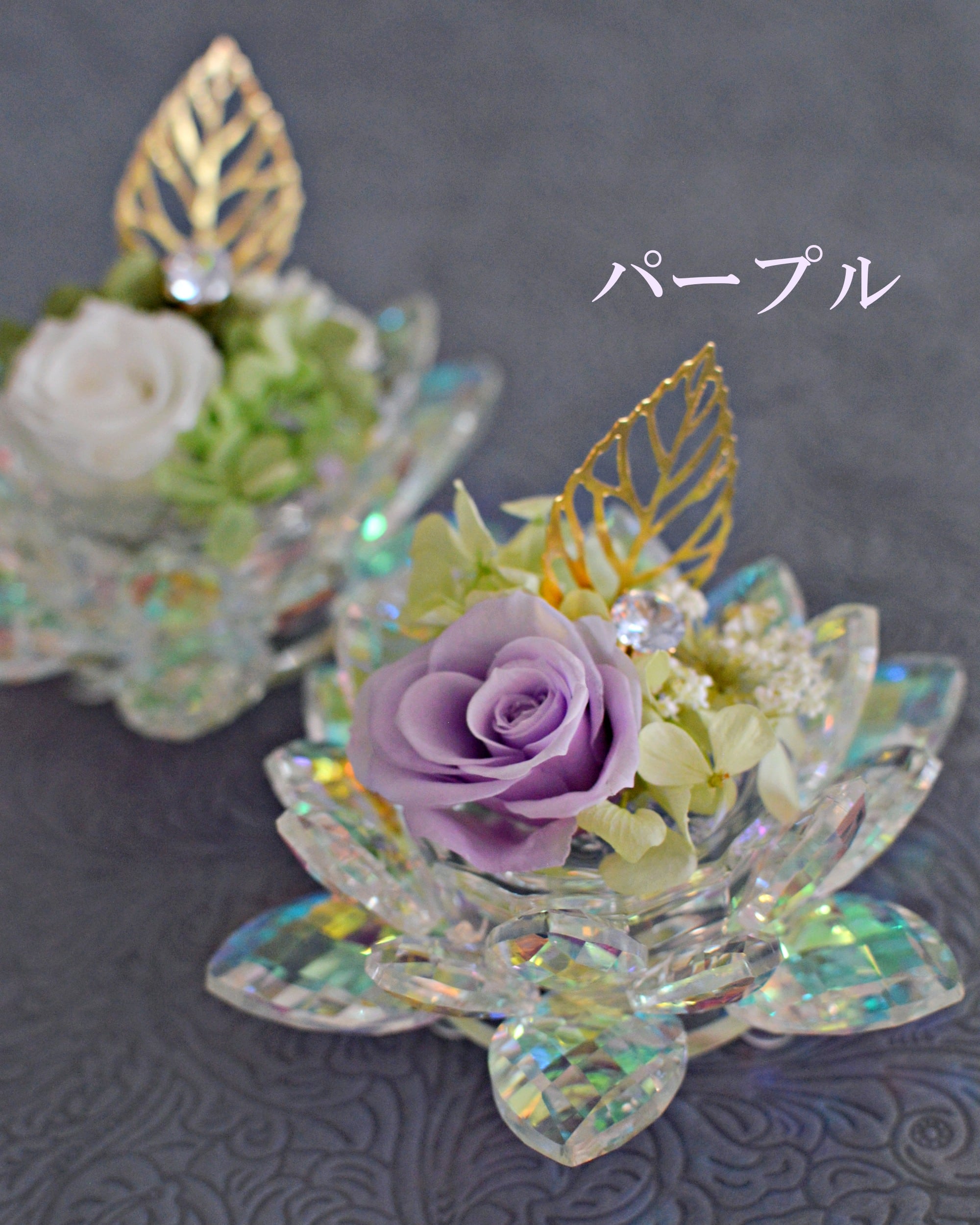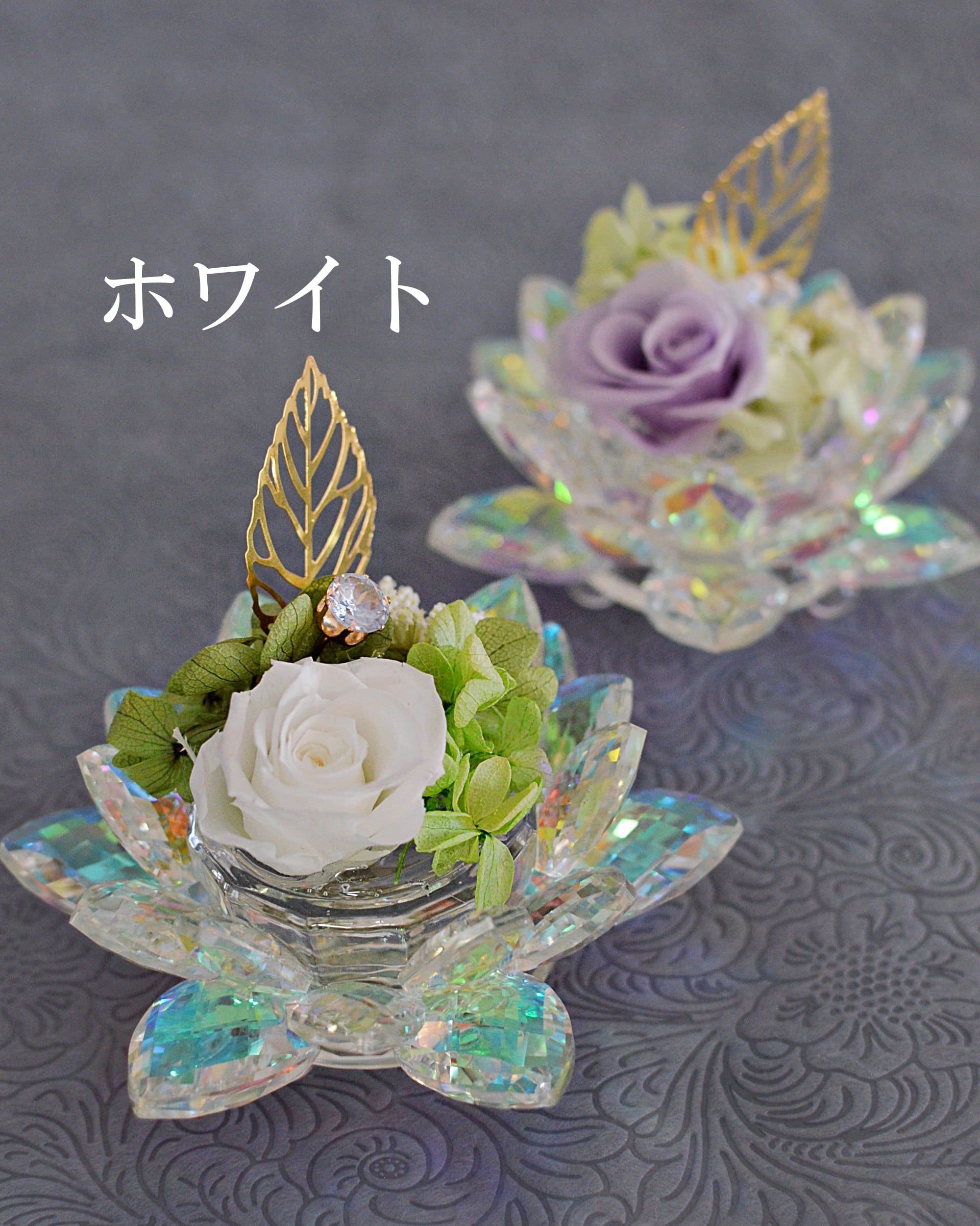 蓮(ハス)の形をした光り輝く置物に、長期保存がきくプリザーブドフラワーをアレンジしています。