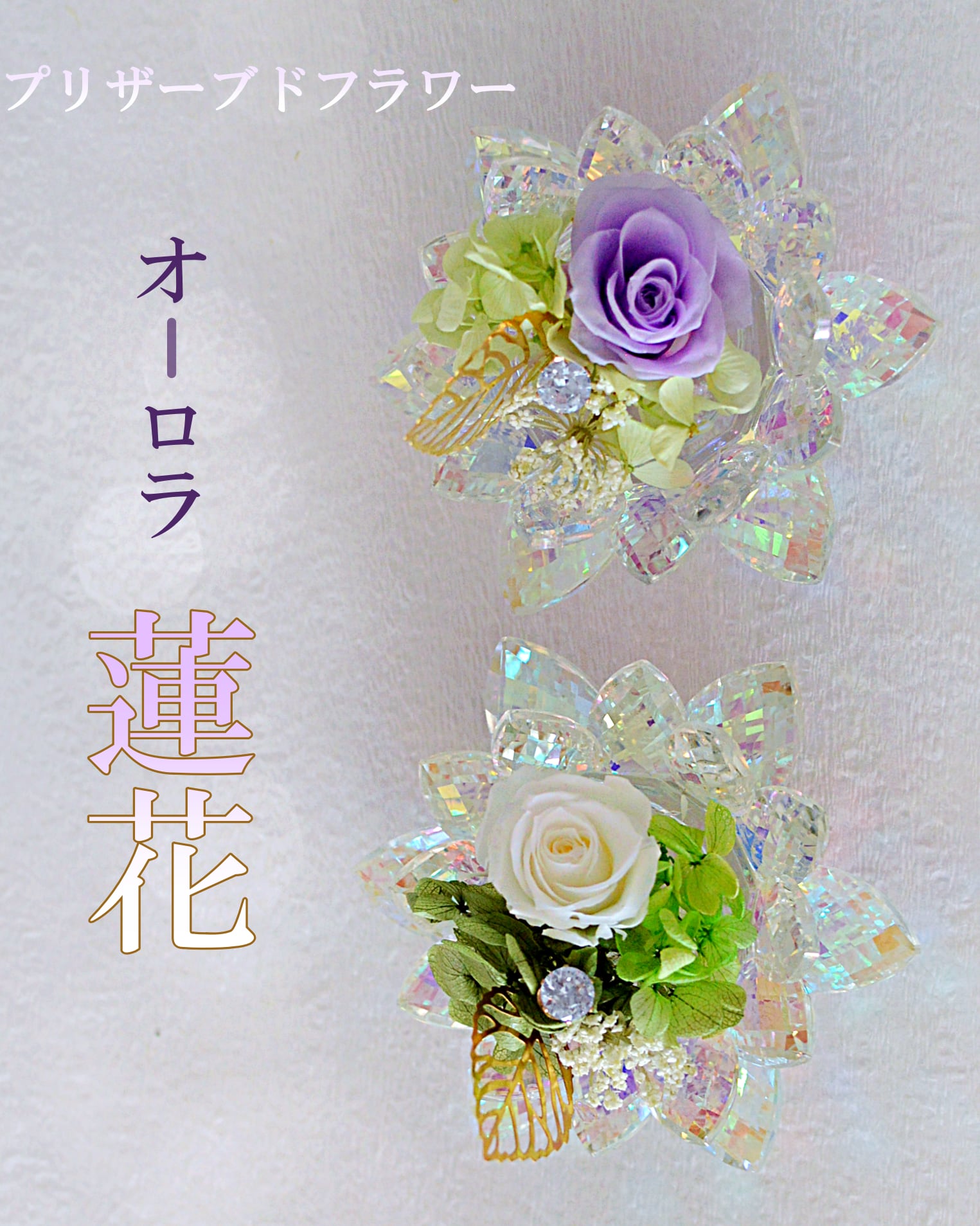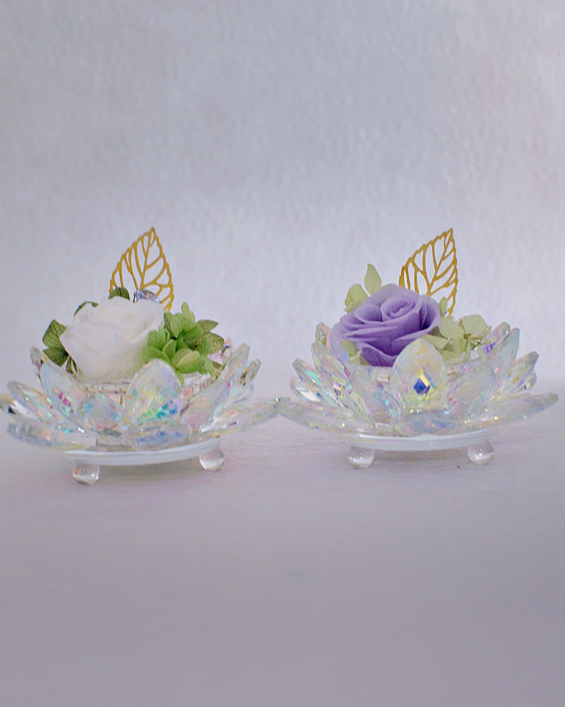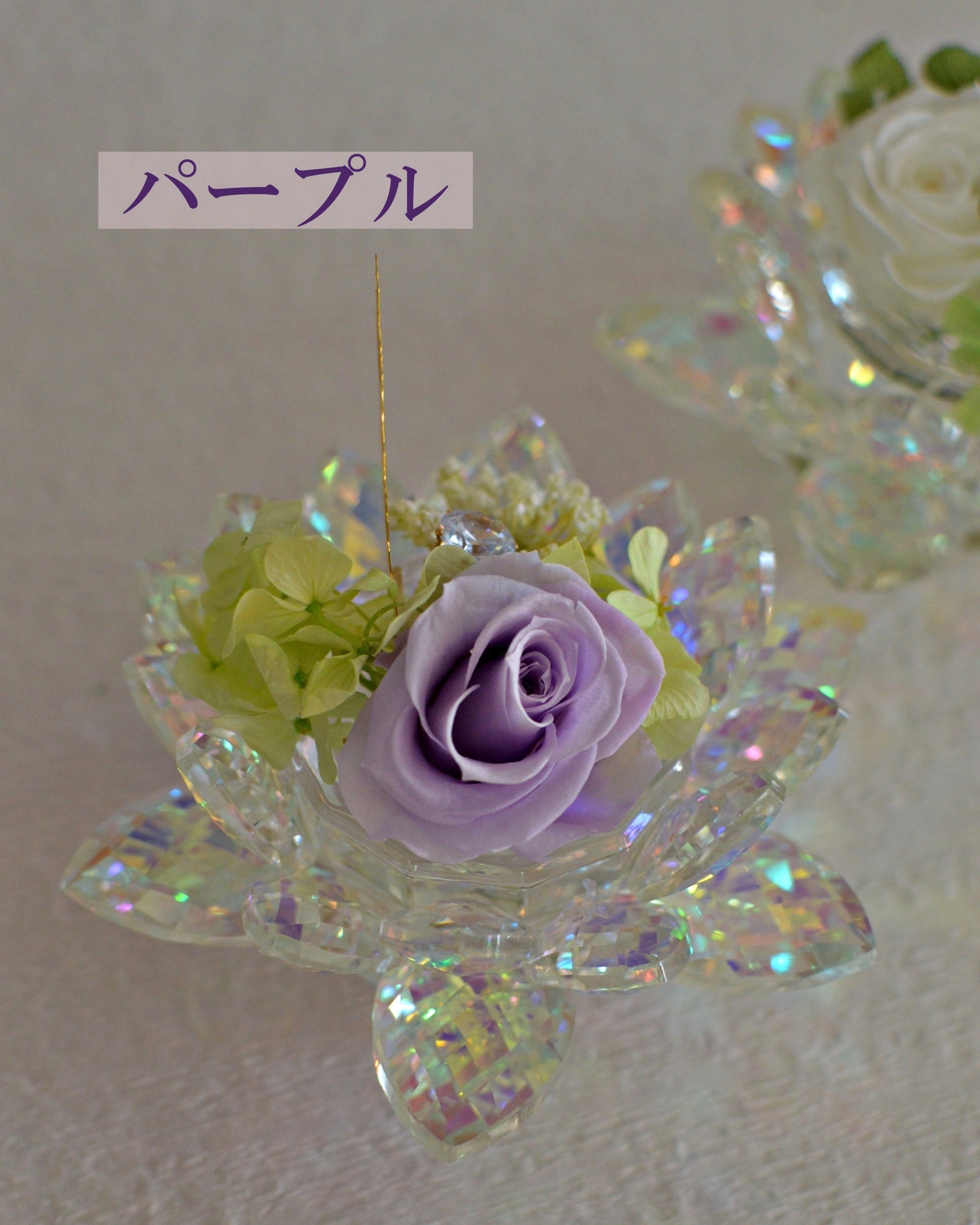 蓮(ハス)の形をした光り輝く置物に、長期保存がきくプリザーブドフラワーをアレンジしています。
