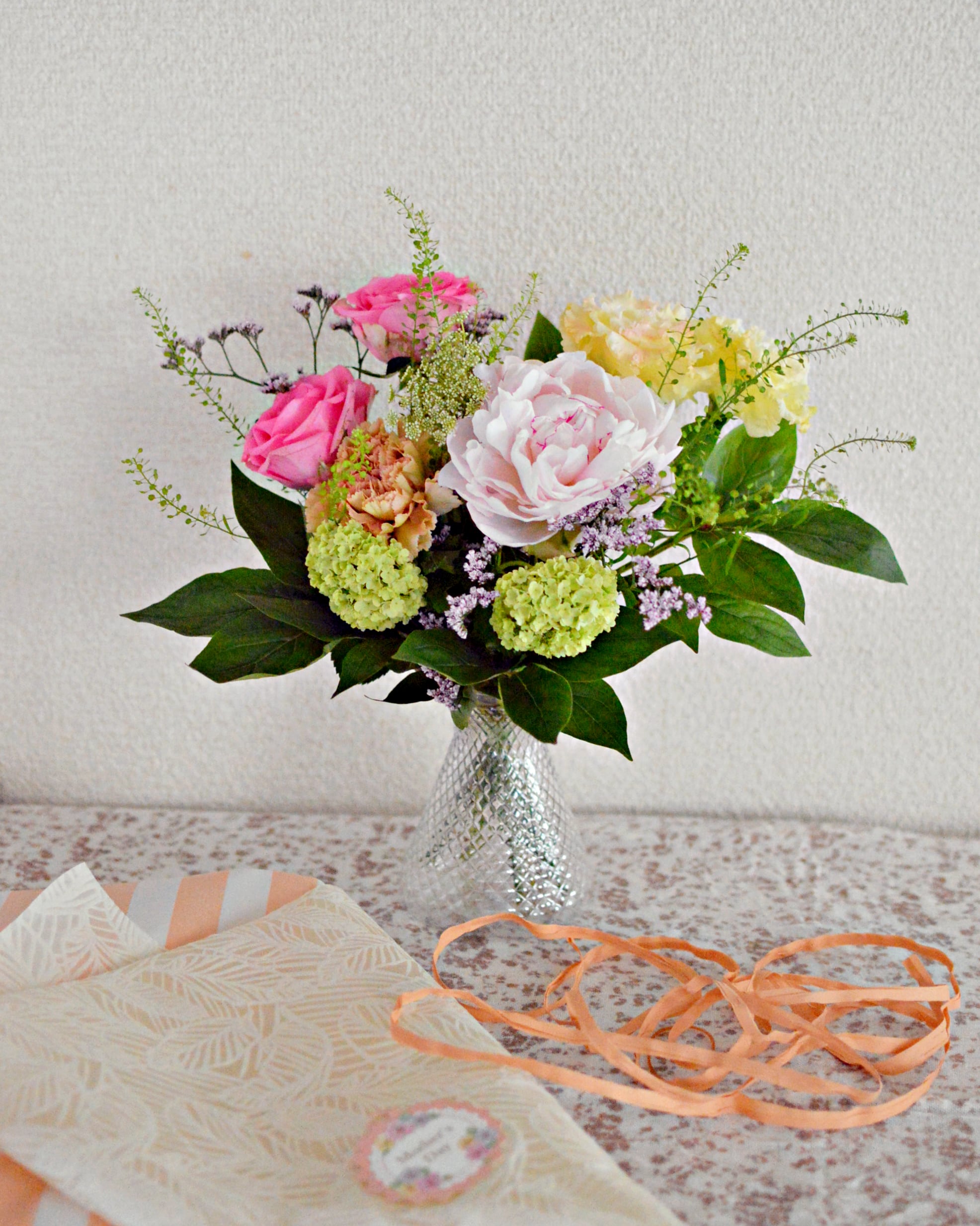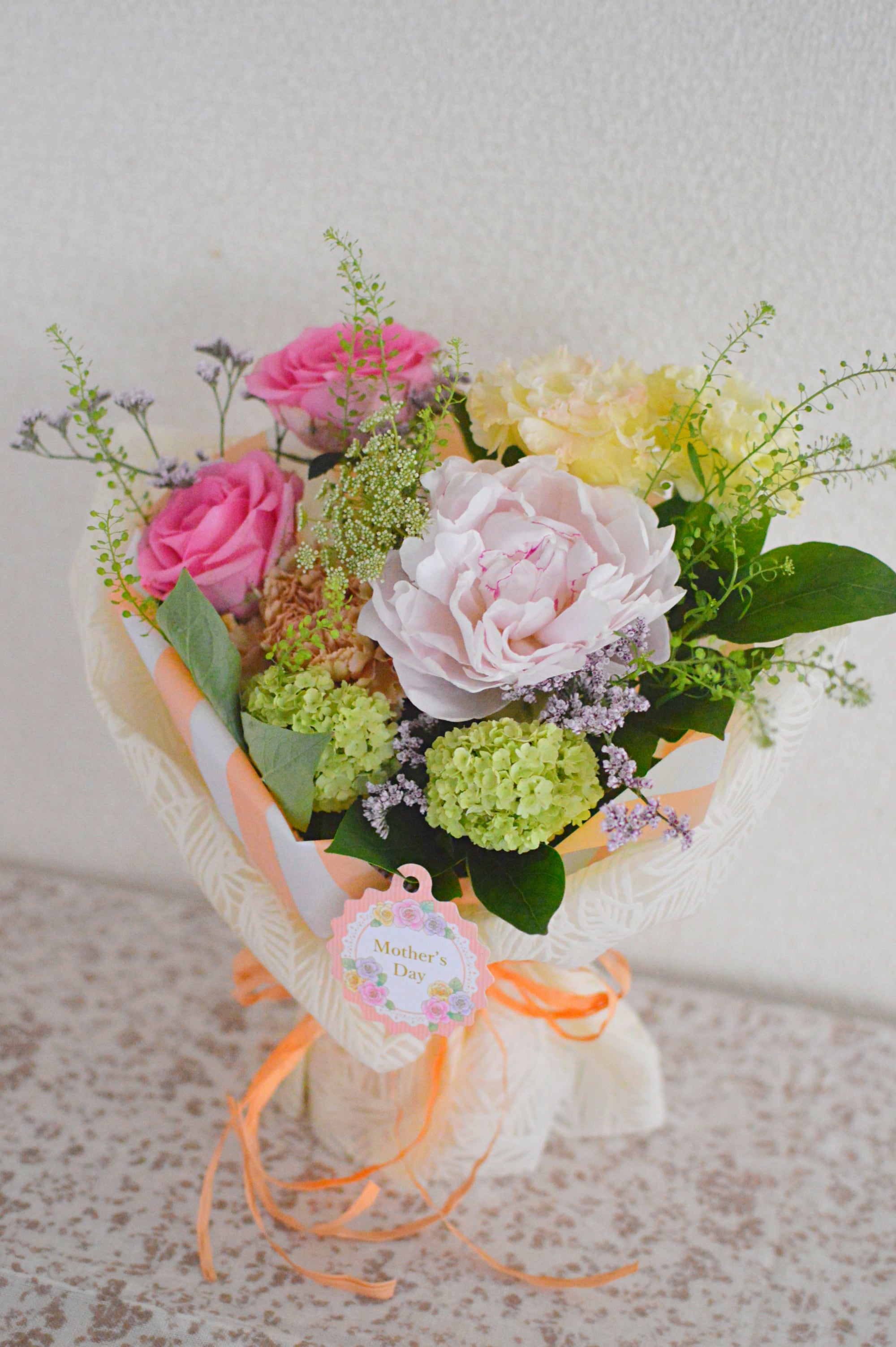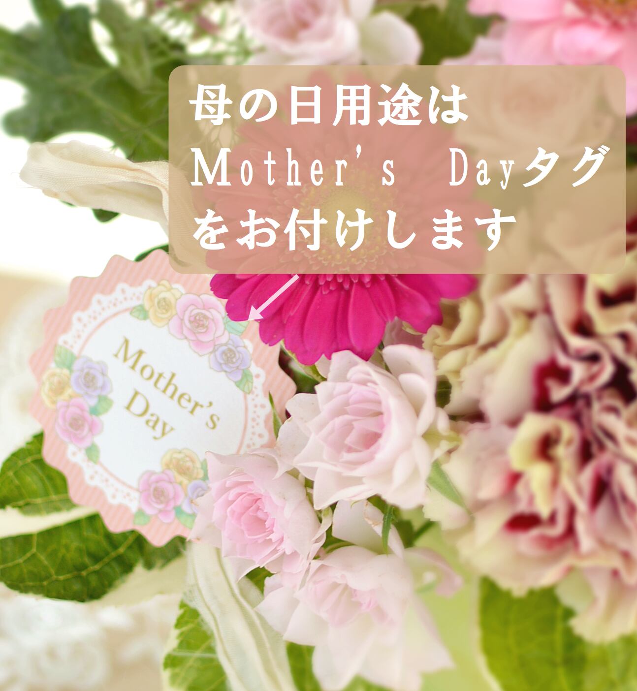 生花素材は、やわらかな雰囲気の母の日にふさわしいカーネーションや季節の花々で、基本おまかせでまとめさせていただきます。