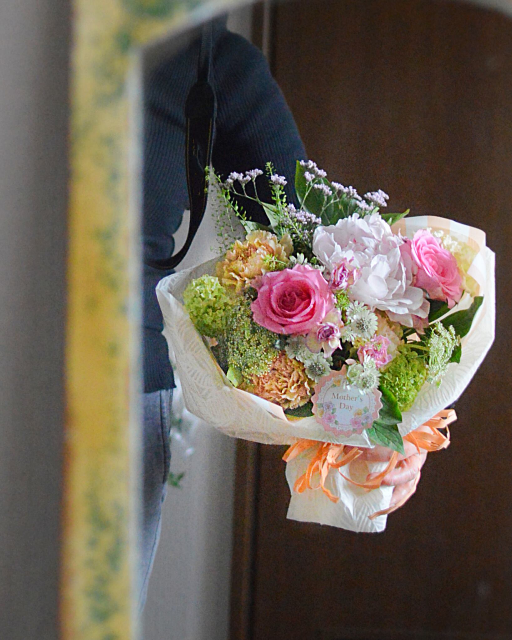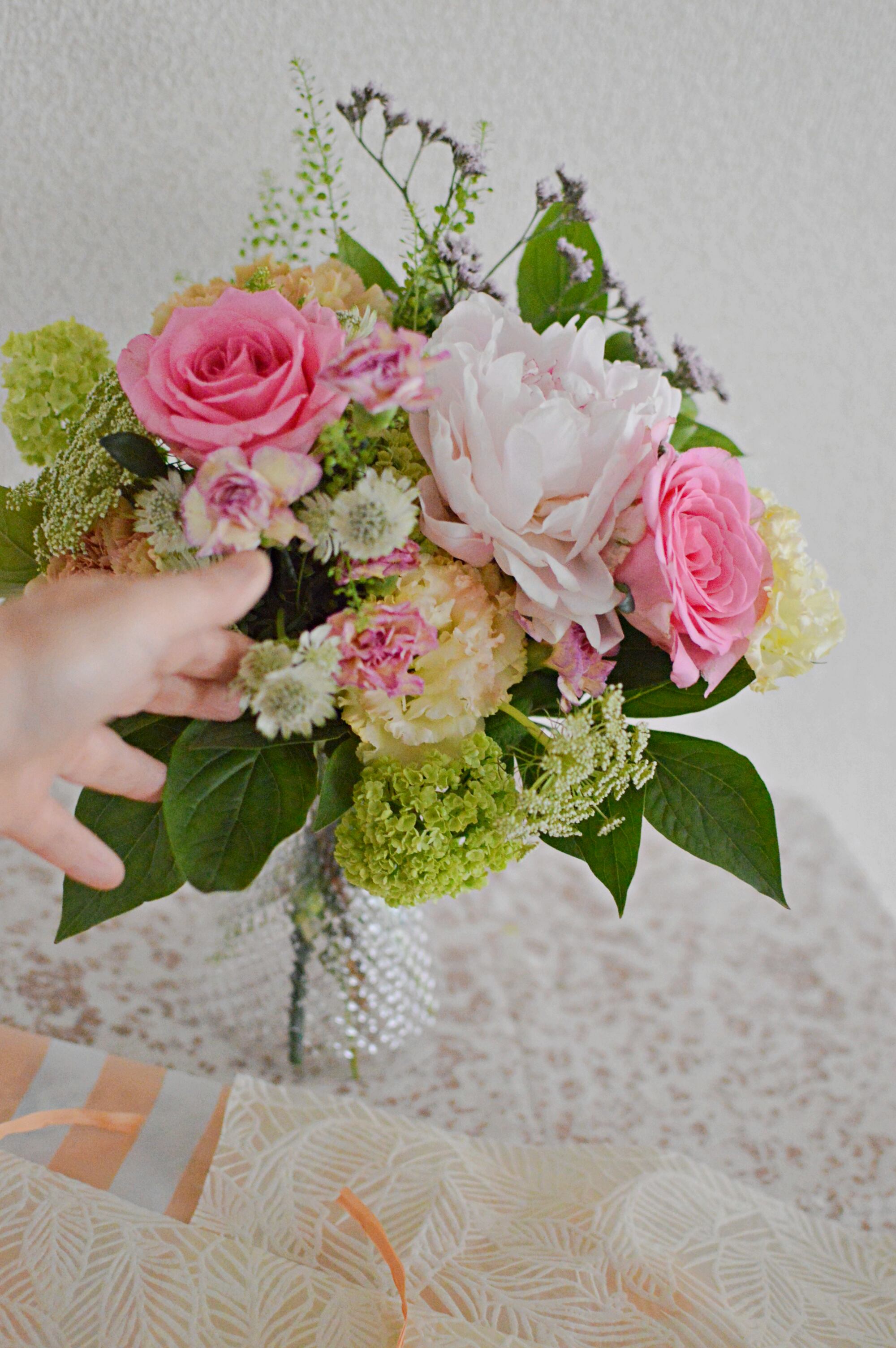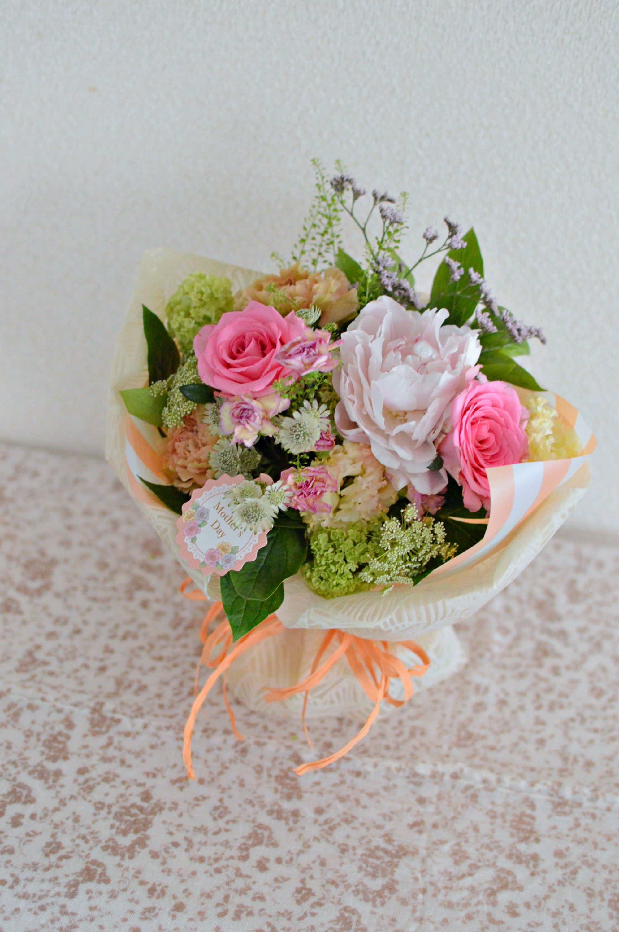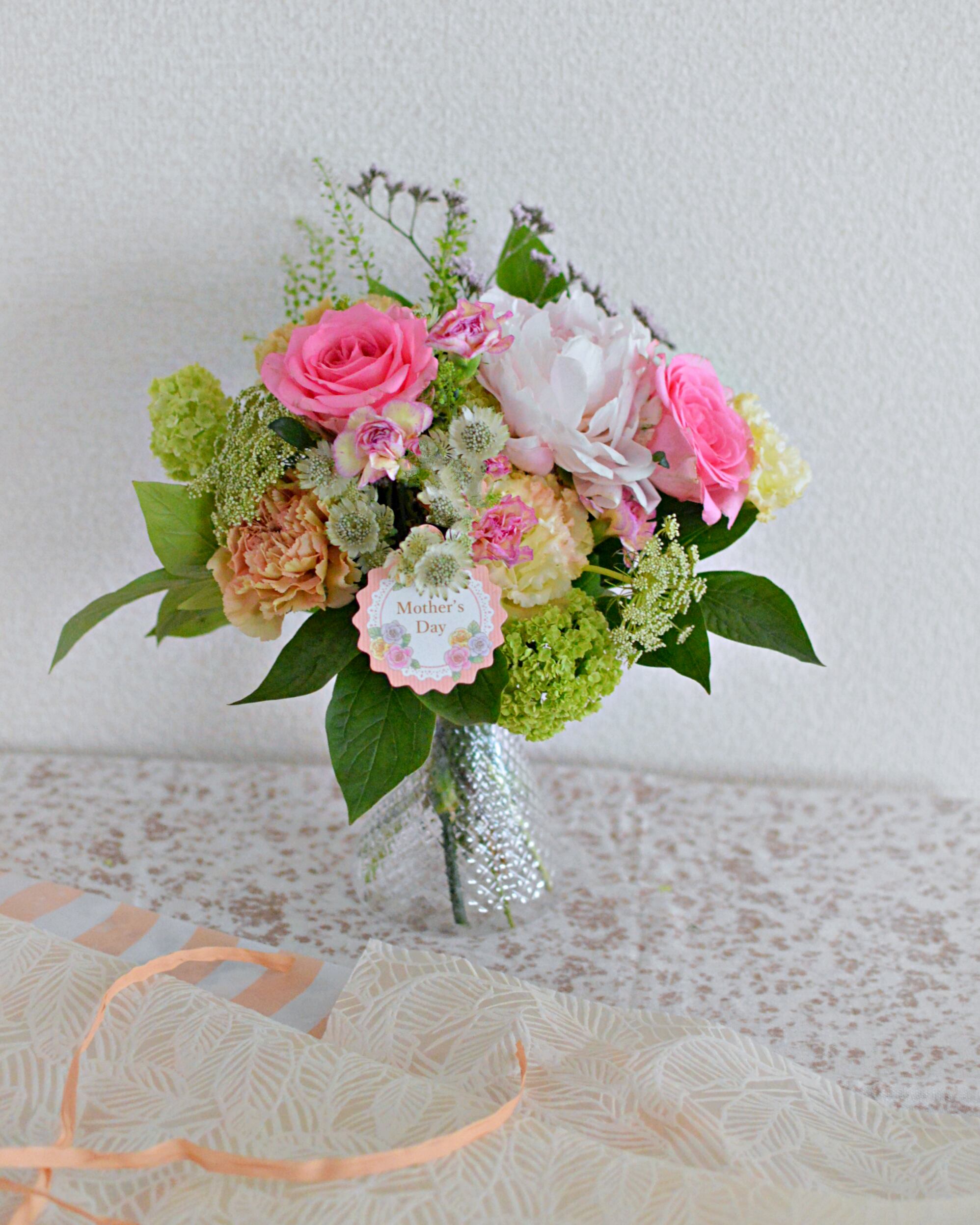 生花素材は、やわらかな雰囲気の母の日にふさわしいカーネーションや季節の花々で、基本おまかせでまとめさせていただきます。