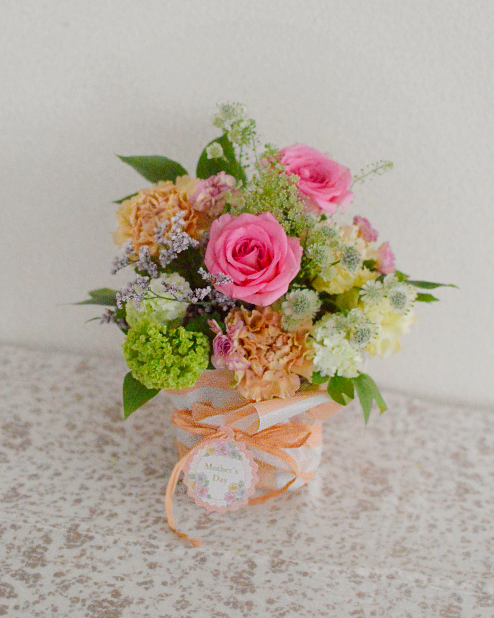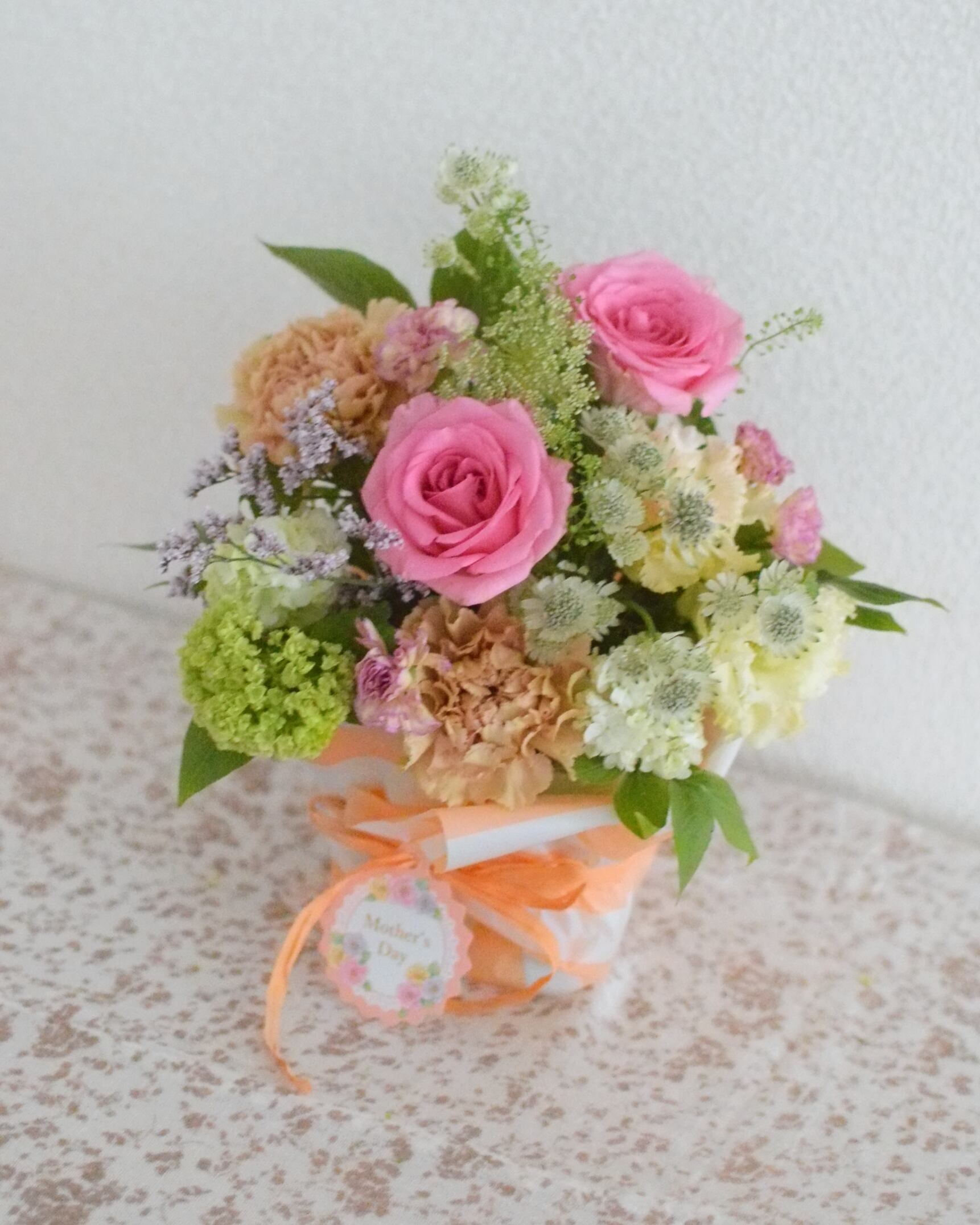 季節のお花をお入れした母の日生花アレンジは、やわらかな雰囲気の母の日にふさわしいカーネーションや季節の花々で、基本おまかせでまとめさせていただきます。