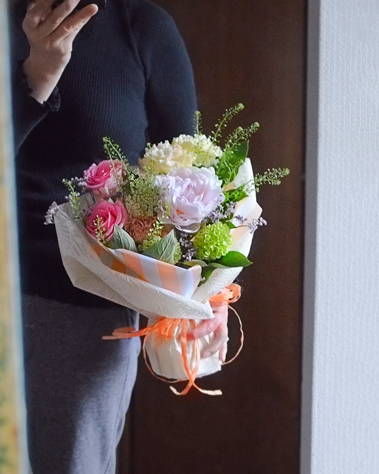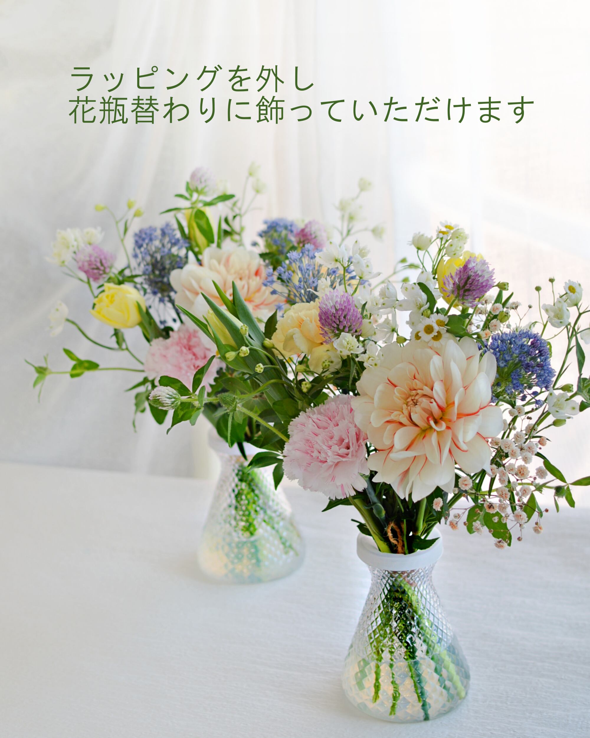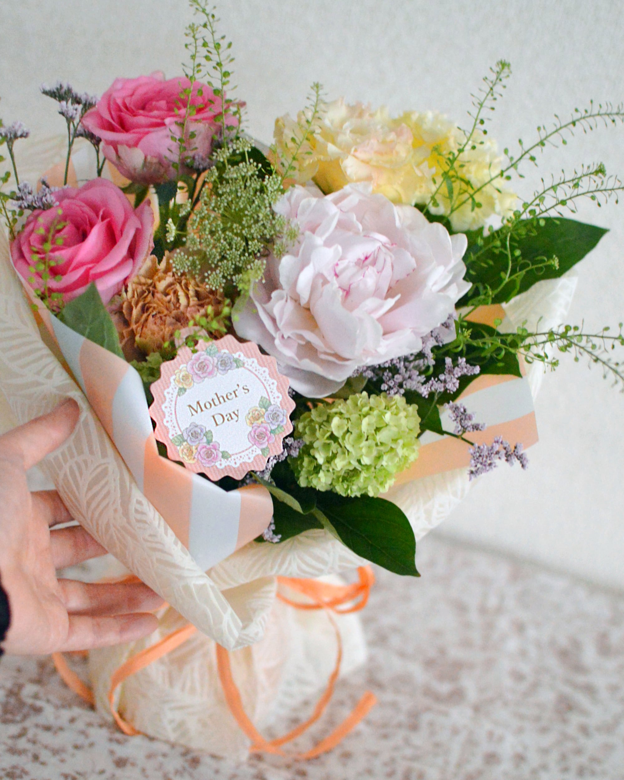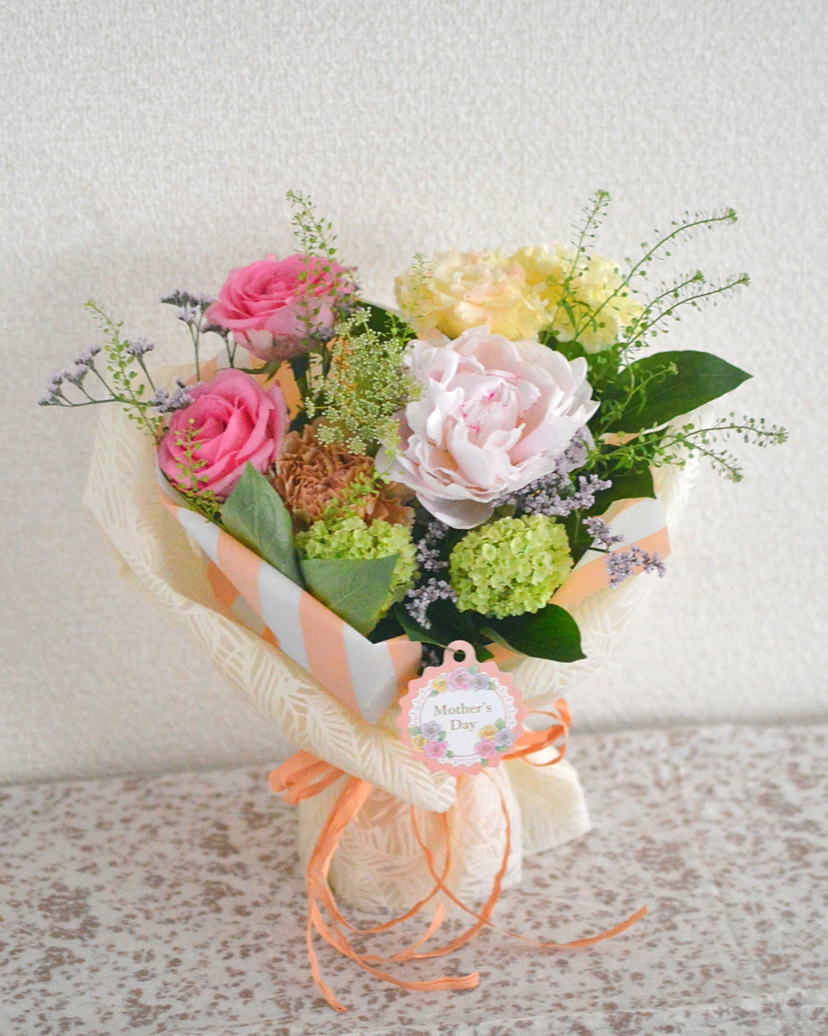 生花素材は、やわらかな雰囲気の母の日にふさわしいカーネーションや季節の花々で、基本おまかせでまとめさせていただきます。