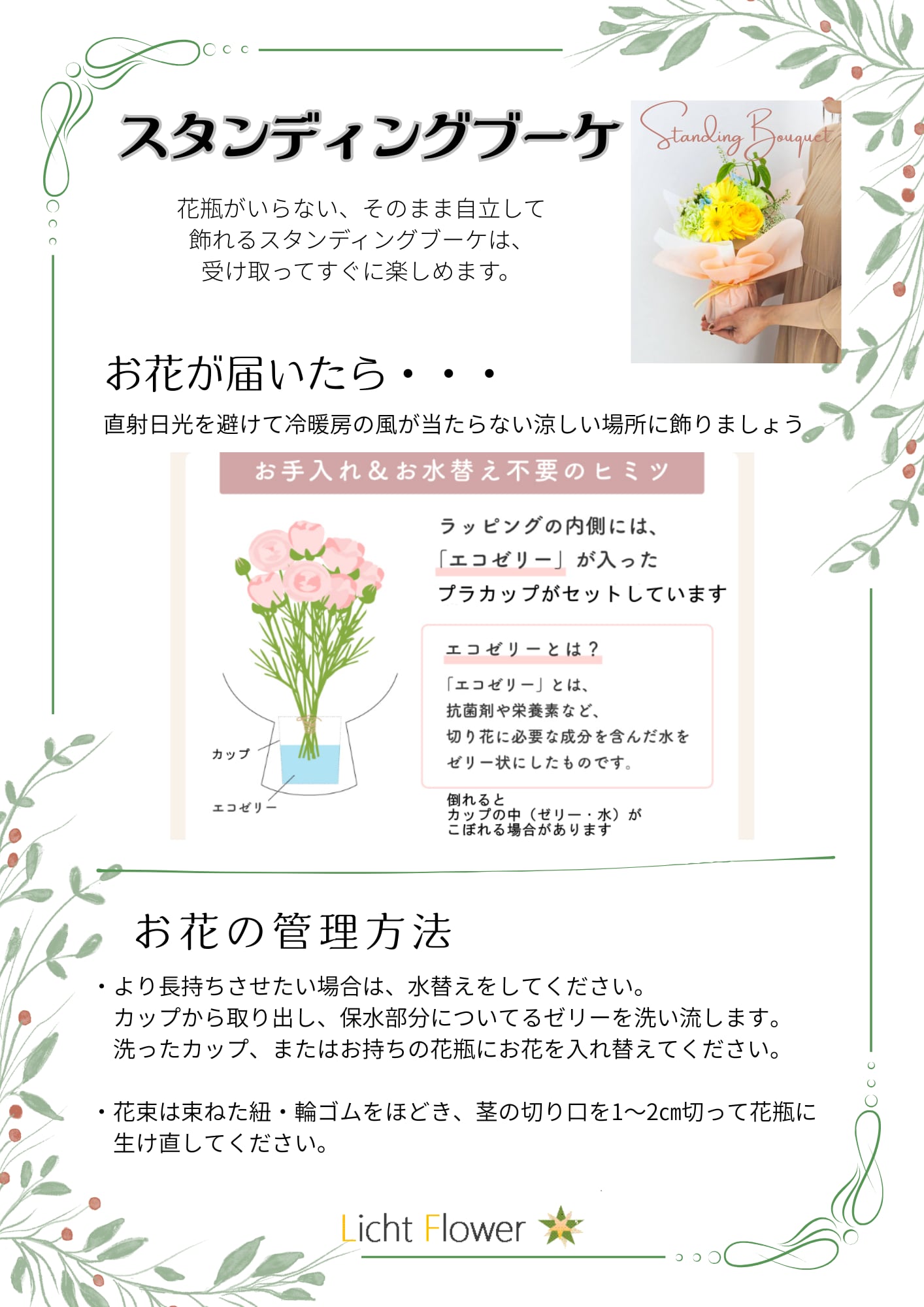 スタンディングブーケのお手入れ方法を添付