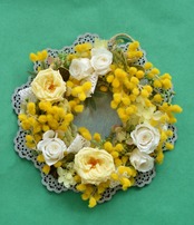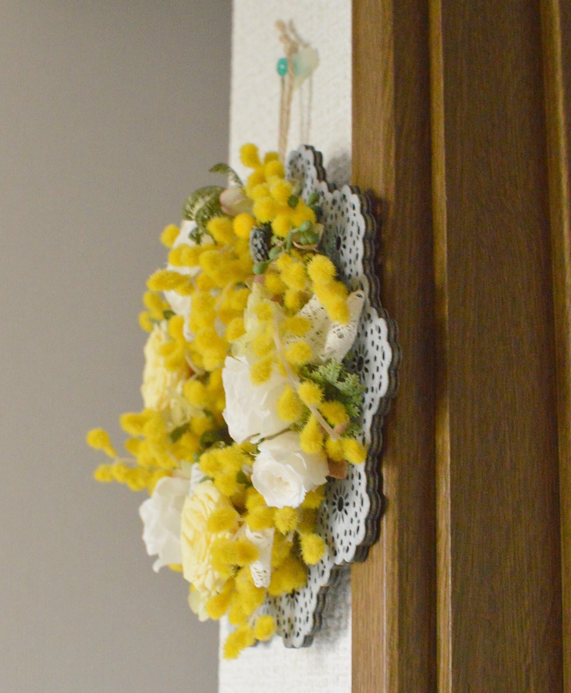 アーティフィシャルフラワーのミモザをたっぷりとアレンジした、愛嬌のあるリースになりました。