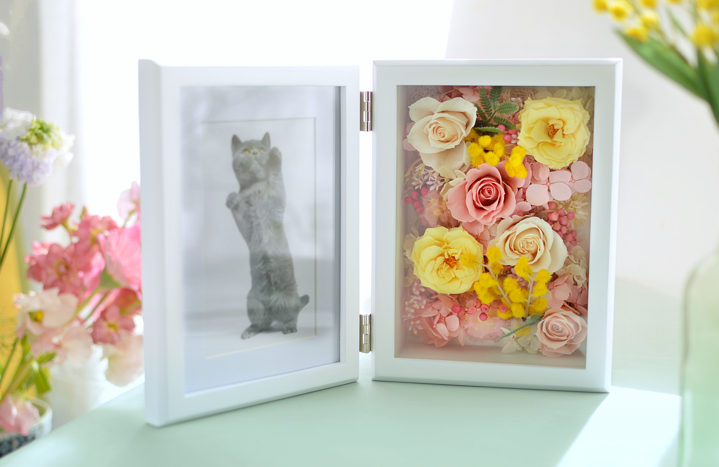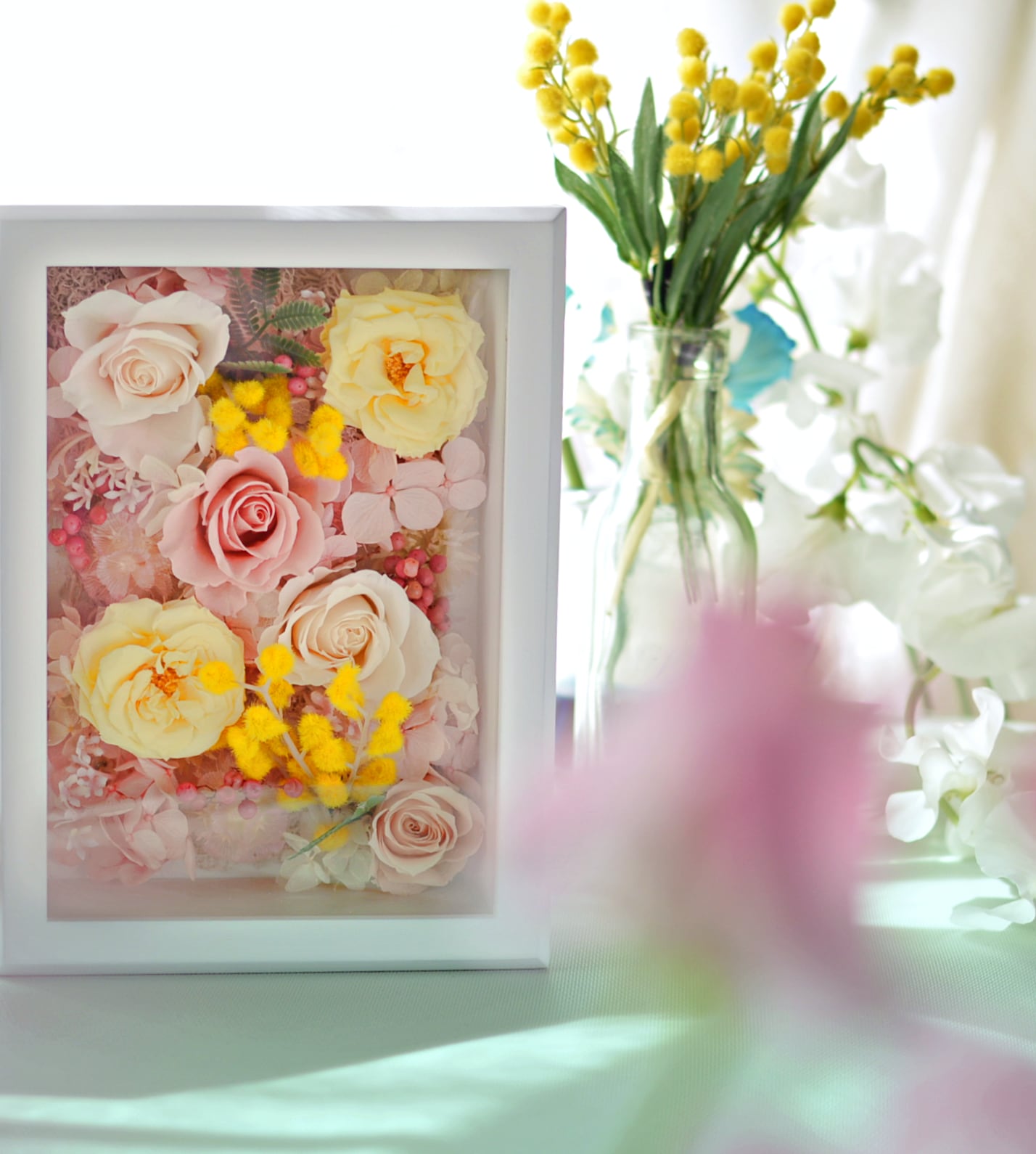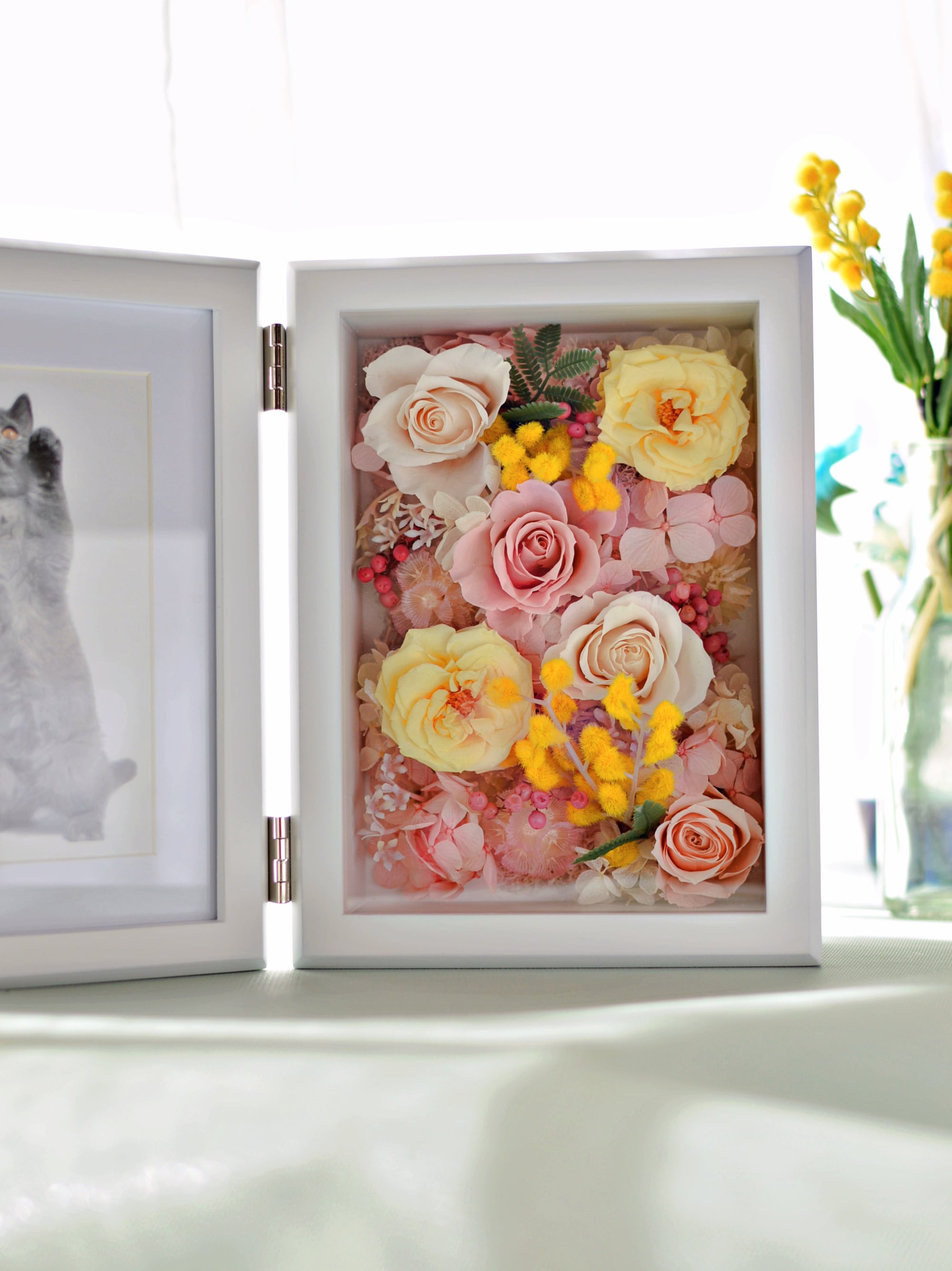 バラと紫陽花のプリザーブドフラワーをメインに、アーティフィシャルフラワーのミモザを入れたフォトフレームアレンジメントです。