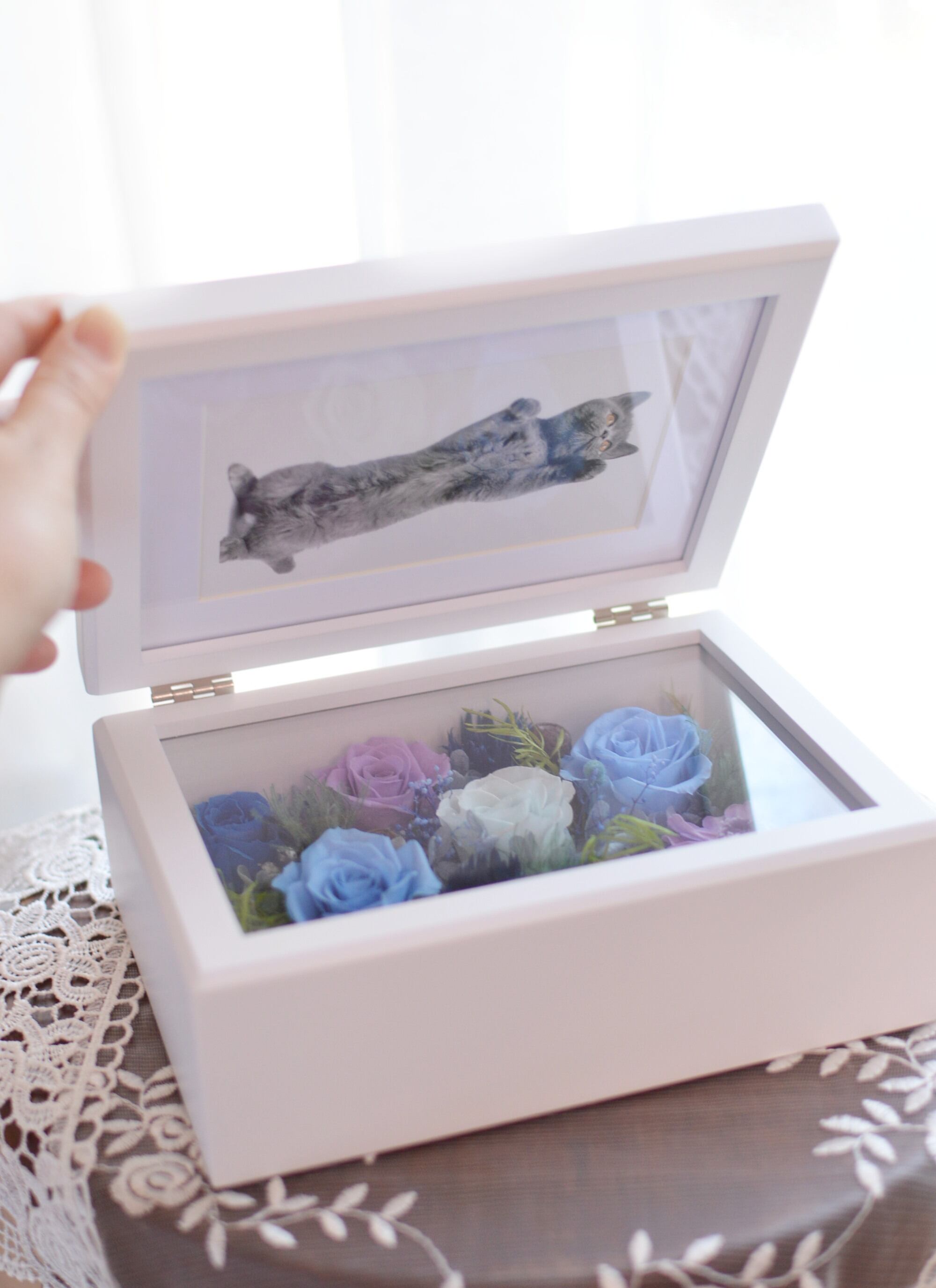 隣のフォトスペースには、お好きな写真やメッセージを添えることもでき、特別な贈り花をご用意いたします。