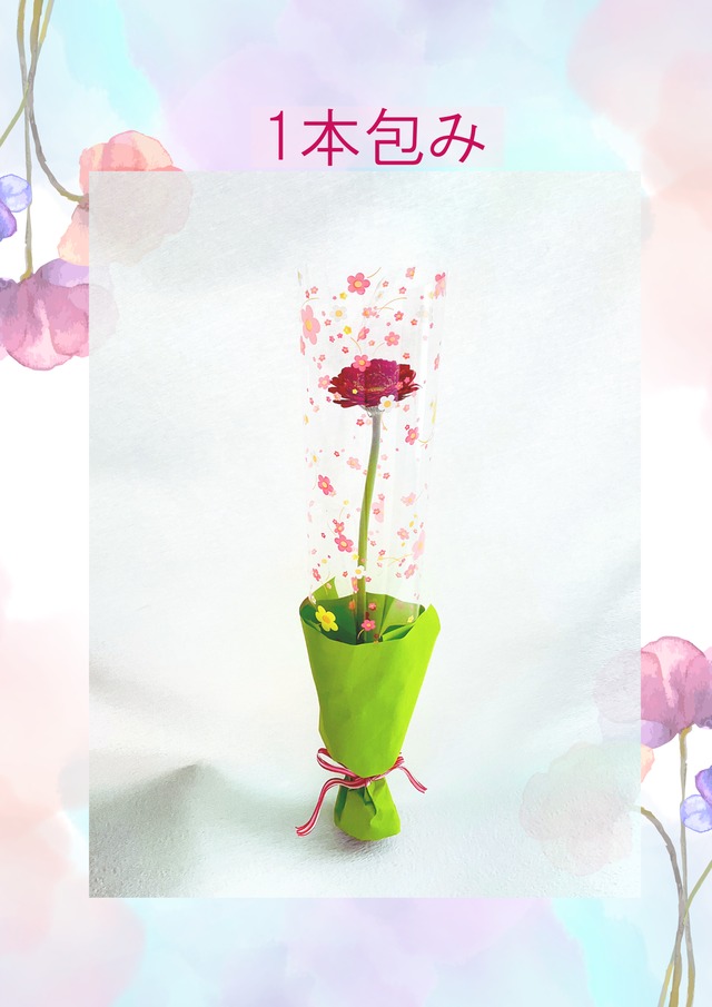 こちらは「1本包み」おまかせでお作りさせていただくイメージとなります。 【ご注文にあたりまして、、】 1本包みをご注文の際は、電話注文がスムーズです。 まずはお気軽にお問合せいただけますと幸いです。 TEL:090-9355-6605 種類は、ガーベラ・チューリップ・スイトピー・カーネーション等、その時に仕入れた質の良い花材を調達しますのでおまかせいただけますようご了承ください。 他、ご指定等がありましたら、備考欄に記載ください。 追って確認しご連絡させていただきます。 サイズ 花丈20~35㎝位×幅10㎝位 【宅配便発送・ご来店・または直接配達希望】 お受け取り方法は、ご注文前にお電話にてお問合せいただけますようお願いいたします。 【お届け期間】ご注文はお届け日の4日前までに。 『ご用途』『希望お届け日時』『時間指定』を購入者情報入力画面の「備考欄」にご記入ください。折り返しお電話にて確認させていただき、決定となります。 それより前を希望される方は、まずはお電話にてご連絡ください。 <<プレゼント・自分用・ご用途の方≫> ご要望等ありましたら備考欄へお書き添えください。