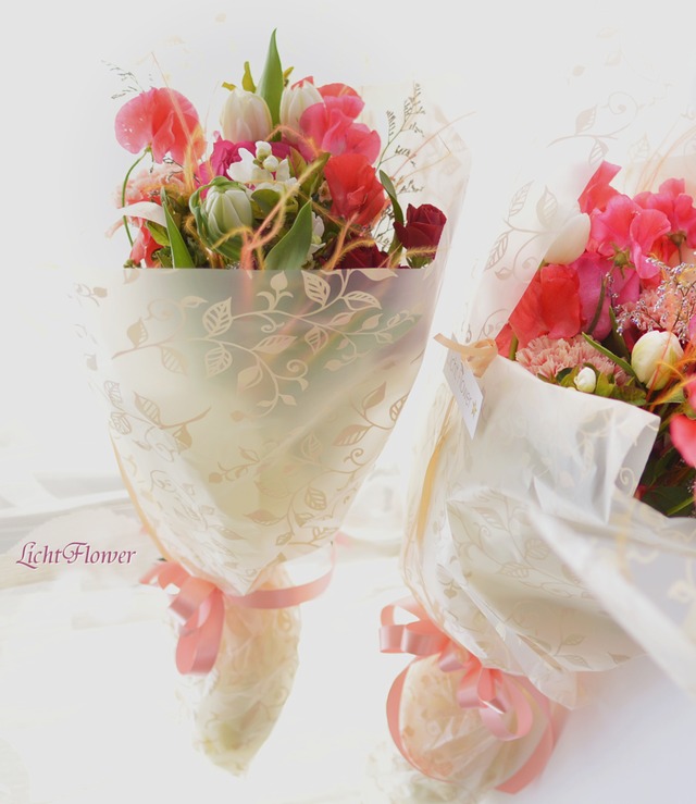 こちらは「2本包み/1束」おまかせでお作りさせていただくイメージとなります。 【ご注文にあたりまして、、】 2本包みをご注文の際は、電話注文がスムーズです。 まずはお気軽にお問合せいただけますと幸いです。 TEL:090-9355-6605 種類は、ガーベラ・チューリップ・スイトピー・カーネーション等、その時に仕入れた質の良い花材を調達しますのでおまかせいただけますようご了承ください。 他、ご指定等がありましたら、備考欄に記載ください。 追って確認しご連絡させていただきます。 サイズ 花丈20~35㎝位×幅12㎝位 【宅配便発送・ご来店・または直接配達希望】 お受け取り方法は、ご注文前にお電話にてお問合せいただけますようお願いいたします。 【お届け期間】ご注文はお届け日の4日前までに。 『ご用途』『希望お届け日時』『時間指定』を購入者情報入力画面の「備考欄」にご記入ください。折り返しお電話にて確認させていただき、決定となります。 それより前を希望される方は、まずはお電話にてご連絡ください。 <<プレゼント・自分用・ご用途の方≫> ご要望等ありましたら備考欄へお書き添えください。